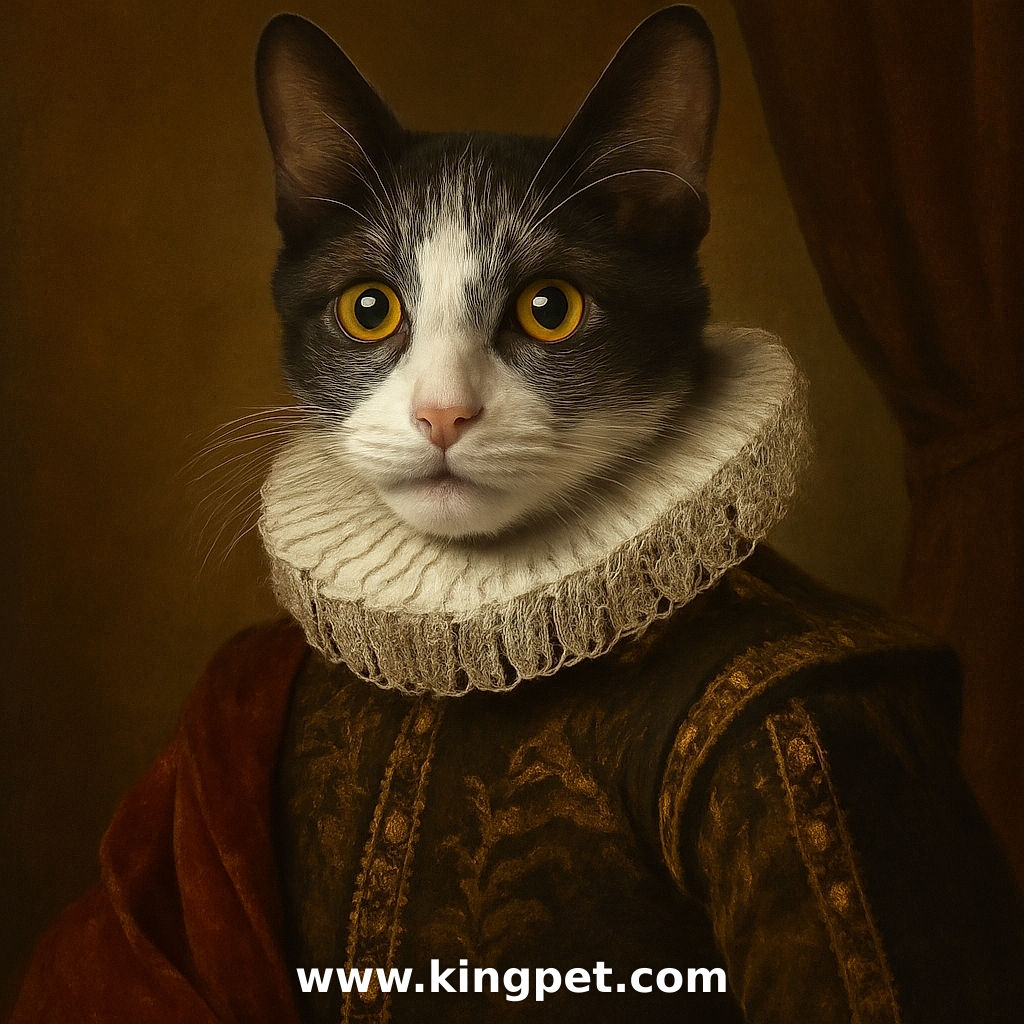 • A dignified black and white cat wearing a tiny white collar and black tie sits proudly among bright orange marigold flowers in a garden, looking like the CEO of the backyard business.