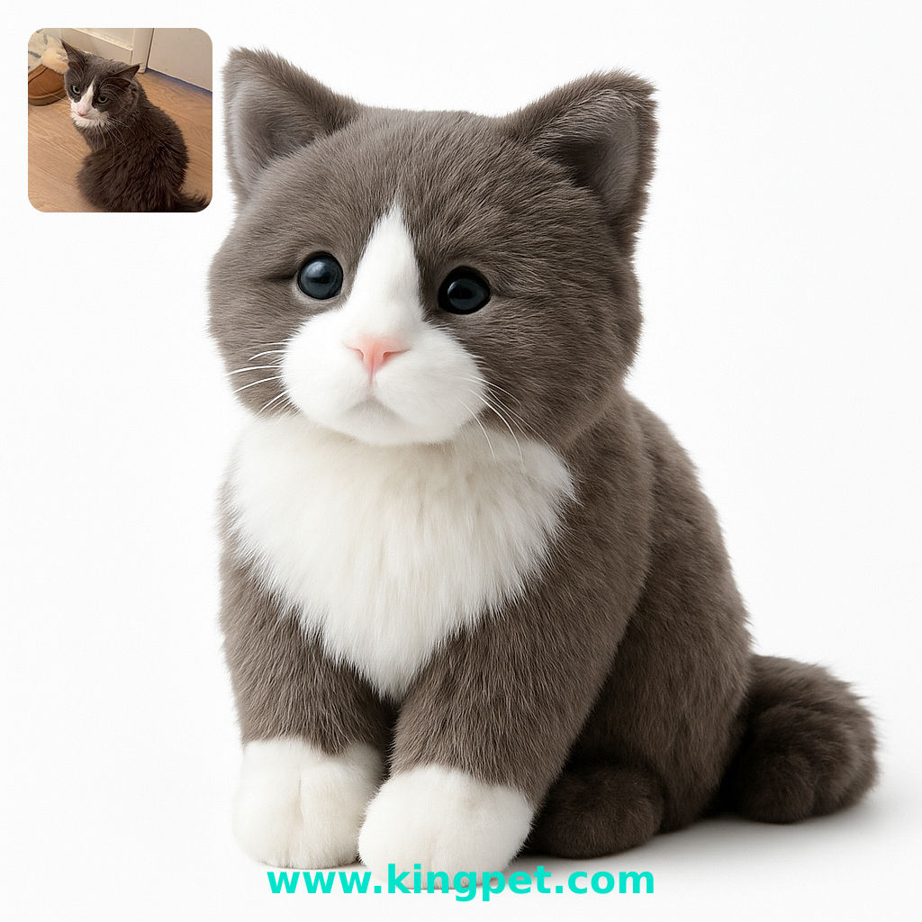 • A majestic fluffy cat sits regally on a dark blanket with a slightly serious expression, its thick fur glowing softly under warm indoor lighting, while a cozy room with windows and curtains forms the background.