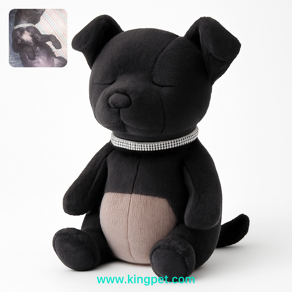 • A sleek black cat lounges on a brown blanket, clutching a cute plush toy shaped like a bull with a red heart on its side, looking cozy and content.