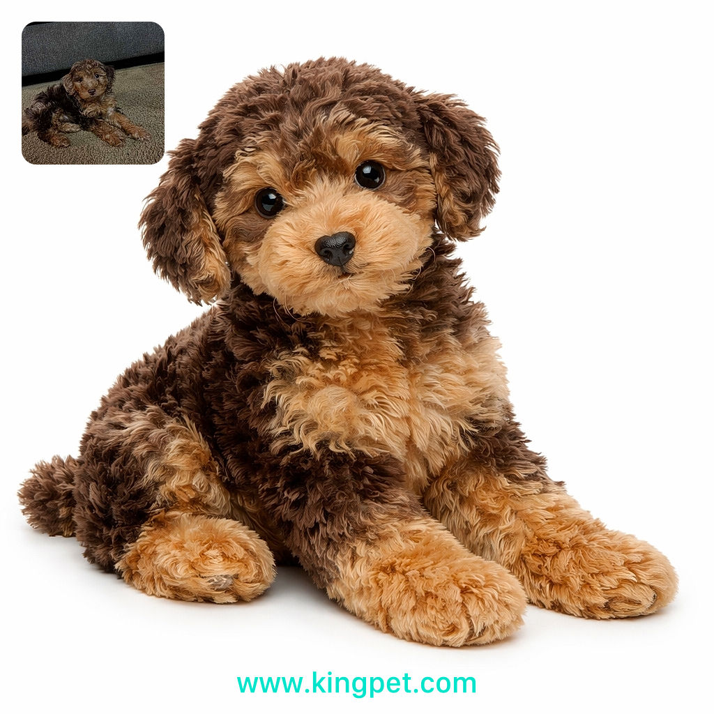 • A fluffy little puppy with expressive greenish eyes sits attentively on a quilted gray couch, wearing a bright orange collar that contrasts nicely with its soft, curly fur. The background includes a folded plastic chair and wooden paneling, adding a cozy indoor vibe.