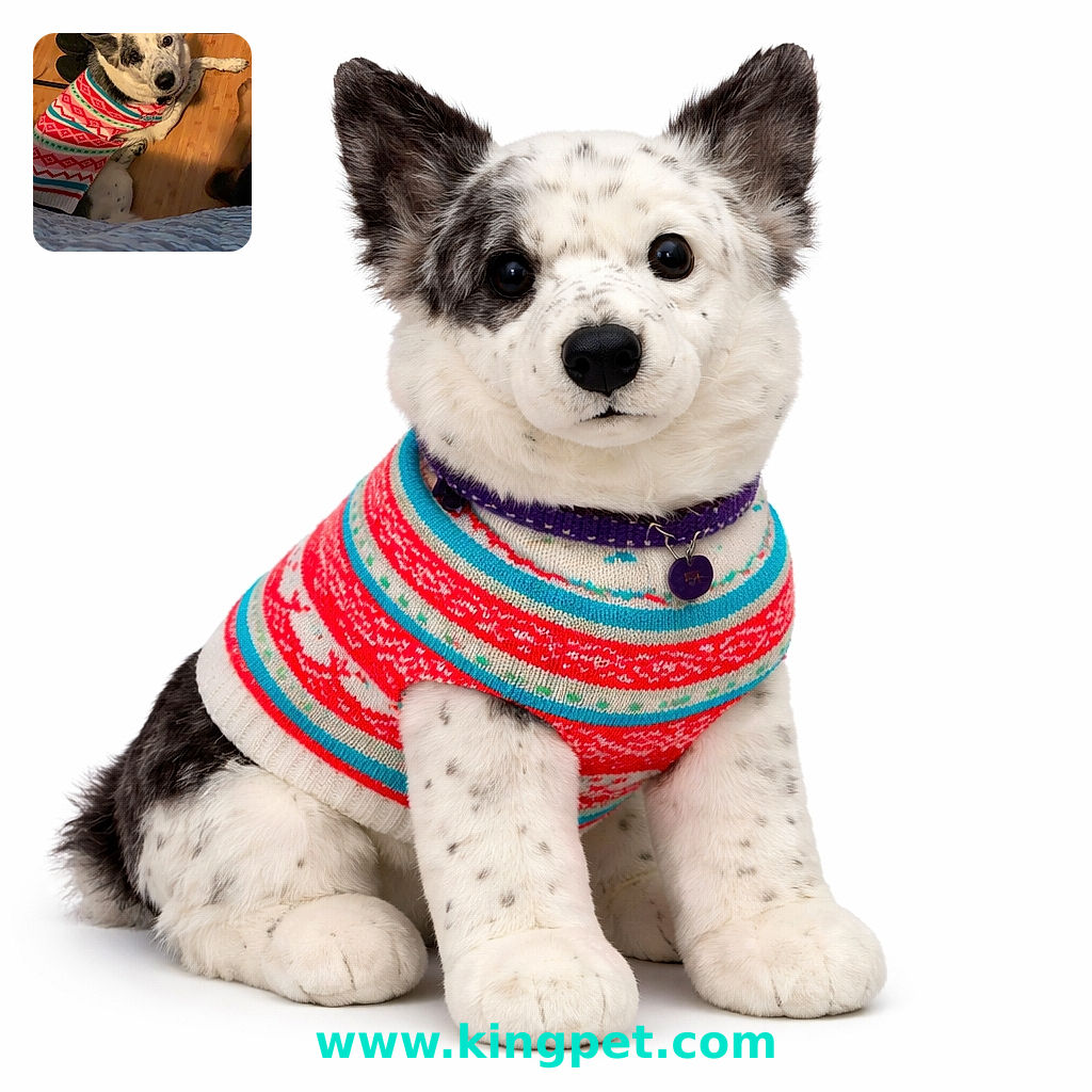 • A spotted pup in a colorful holiday sweater looks up with an adorably guilty 'did I do that?' expression while lounging on a warm wooden floor next to shoes and a quilt — equal parts cozy and mischievous.